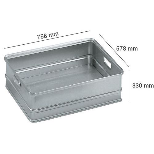 | Produktname | Transportbehälter aus Aluminium - Länge 758 mm - 77 bis 155 L, Gesamtinhalt: 116 L, Gesamthöhe: 330 mm |
