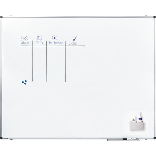 Oberfläche aus lackiertem Stahl Oberfläche zum Beschriften mit Markern Aluminiumrahmen mit dunkelgrauen Kunststoffecken 30 cm lange Stiftablage Einfache Wandbefestigung mit verborgenem Schlitz Lässt sich horizontal oder vertikal montieren Montageteile, Stiftablage und Marker im Lieferumfang enthalten