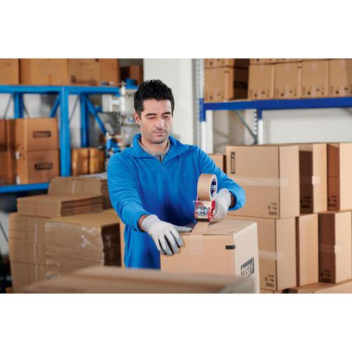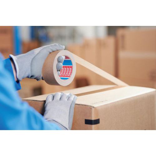 Adhésif d'emballage tous usages composé d'un support papier finement crêpé et d'une masse adhésive en caoutchouc naturel. Convient à l'emballage léger.