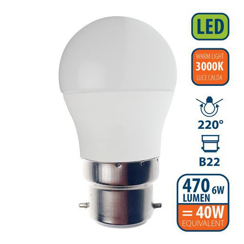 Ampoule Led Smd mini-Sphérique P45 6W culot B22, Flux lumineux: 470 lm, Type de culot: B22