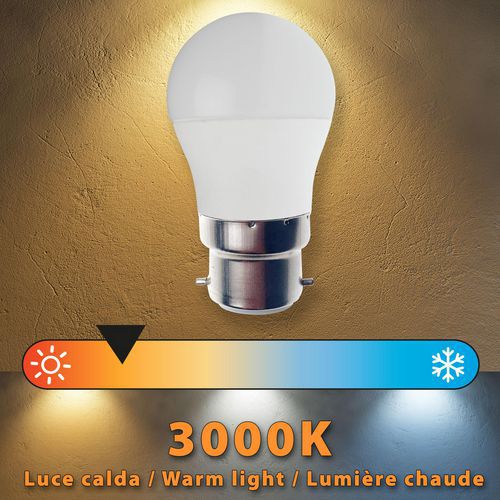 Avec une durée de vie de 20000 heures (bien supérieure aux standards du marché), l'ampoule peut durer plus de 15 ans (avec une utilisation quotidienne de 3 heures). ATTENTION: la connexion est B22 baïonnette, spécifique pour la France.Elle vous offre 470 lumens de luminosité instantanée, sans avoir à attendre que l'ampoule se réchauffe. Diffuseur opalisé qui rend la lumière homogène, non éblouissante et bien diffusée (angle 220 degrés).