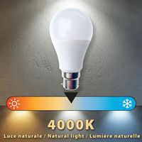 Avec une durée de vie de 20000 heures (bien supérieure aux standards du marché), l'ampoule peut durer plus de 15 ans (avec une utilisation quotidienne de 3 heures). ATTENTION: la connexion est B22 baïonnette, spécifique pour la France.Elle vous offre 806 lumens de luminosité instantanée, sans avoir à attendre que l'ampoule se réchauffe. Diffuseur opalisé qui rend la lumière homogène, non éblouissante et bien diffusée (angle 200 degrés).