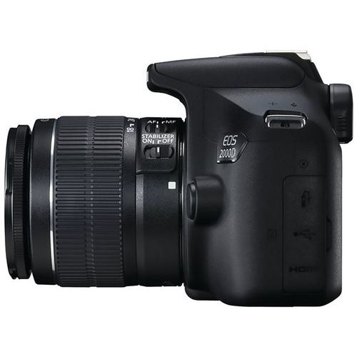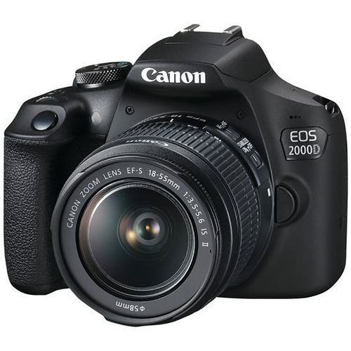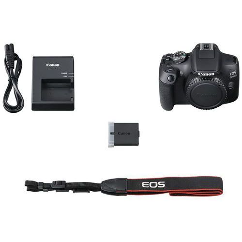 Composition du coffret : - Canon EOS 2000D - Canon LP-E10 - objectif EF-S 18-55 mm IS II - chargeur de batteries - cache-poussière - capuchon - capuchon pour objectif - sangle pour le cou - câble USB - œilleton