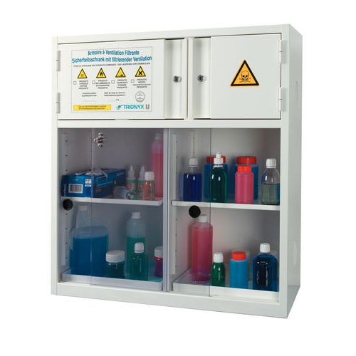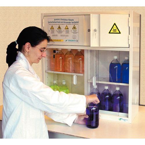 3 compartiments distincts avec serrure : Compartiment pour produits toxiques. Compartiment pour produits chimiques, avec 2 étagères perforées et 2 bacs collecteurs amovibles. Compartiment avec ventilation/filtre (ventilateur silencieux, 230 V-50 Hz).