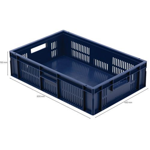 Bac norme Europe bleu à grande stabilité au gerbage. Large ventilation garantie avec les parois ajourées. Manipulation aisée grâce à ses larges poignées ouvertes. Résistance aux huiles, graisses et nombreux produits chimiques.