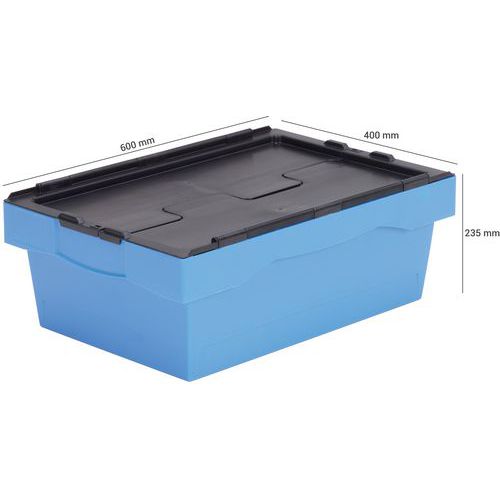 Identification flux logistiques facilitée par le coloris des couvercles. Polyvalent, adapté aux manutentions manuelles et automatisées. Sécurisation du contenu via un couvercle plombable et scellable. Bac gerbable et emboîtable à vide pour un gain de place optimal. Charge maxi (kg) : 25 kg
