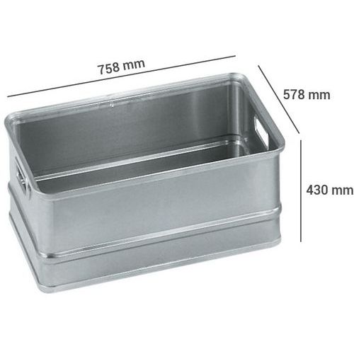 | Intitulé du produit | Bac de transport aluminium, Capacité: 155 L, Hauteur hors tout: 430 mm, Largeur hors tout: 578 mm |
