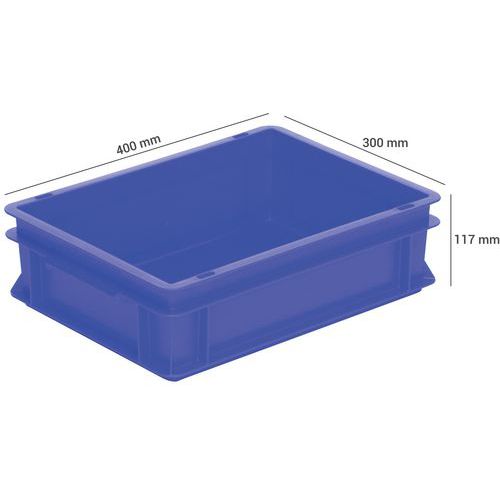 Bac gerbable norme Europe. Equipé de parois pleines, fond plein et poignées coquilles. Charge maxi (kg) : 20 kg Usage alimentaire Garantie client : 3 ans