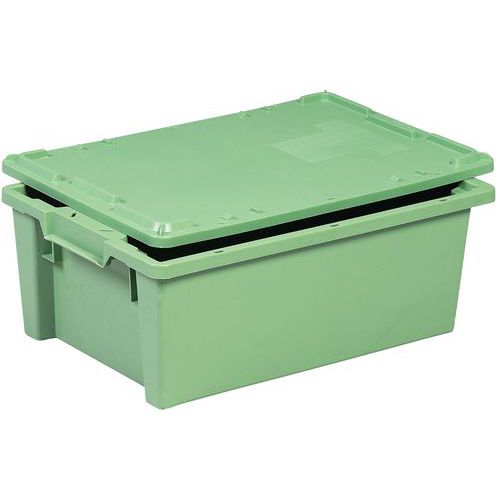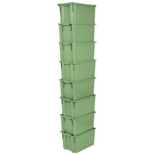 Gerbable ou emboîtable par simple retournement grâce à sa structure asymétrique. Gain de place à l’emboîtement de 65%. Fond plat pour compatibilité avec convoyeurs automatiques. Bac gerbable compatible alimentaire. Disponible en 5 modèles.