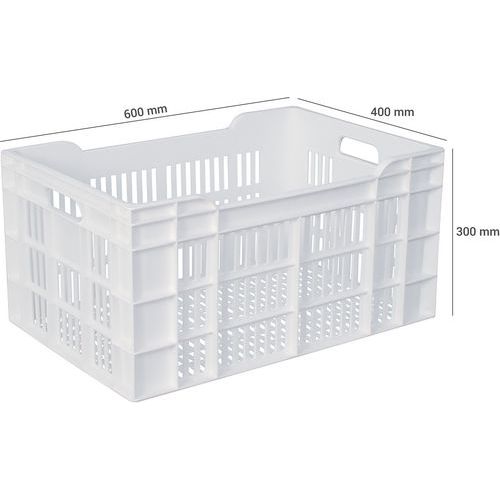 | Intitulé du produit | Bac norme Europe à parois et fonds ajourés, Capacité: 60 L, Gerbable: oui, Hauteur hors tout: 300 mm |