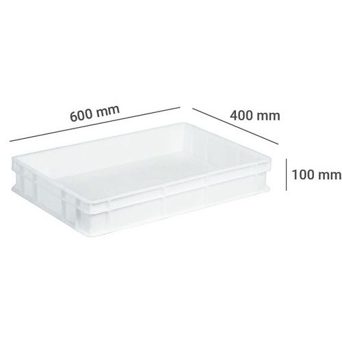 | Intitulé du produit | Bac Norme Europe à parois et fonds pleins, Capacité: 18 L, Gerbable: oui, Hauteur hors tout: 100 mm |