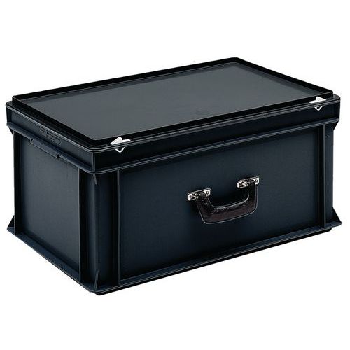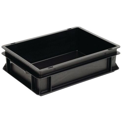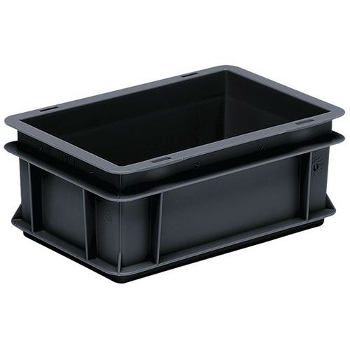 Bacs gerbables Norme Europe en matière conductrice disposant de parois pleines, un fond plein ou compact et deux poignées coquilles ou pleines.