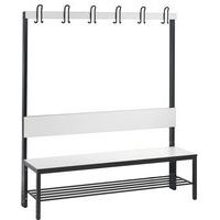 Banc de vestiaire avec dossier et patères, de construction solide, avec ou sans grille-chaussures selon modèle. Très belle finition avec revêtement bois massif : assise, dossier et barre à crochets HPL, résistant à l'humidité. Barre à crochets avec double crochets à revêtement plastique de protection, répondant à la norme DIN 7917. Banc avec patins vérin de sol protecteurs, ajustables pour une compensation parfaite de la hauteur (10 mm). Structure tube d’acier section 30 x 30 mm. Revêtement assise HPL épaisseur 13 mm. Modèle avec grille porte-chaussures : châssis zingué par électrolyse.