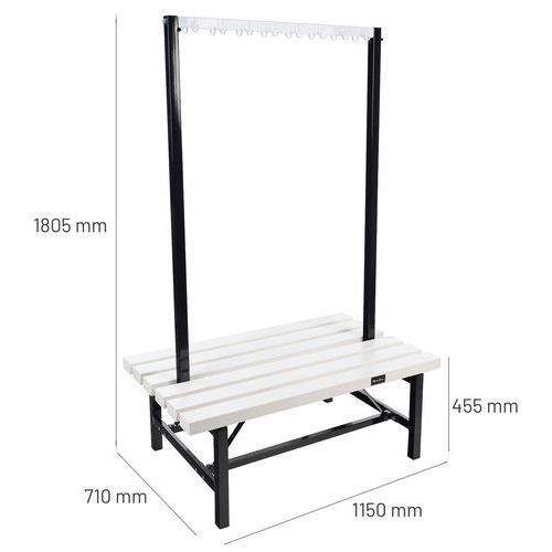 | Intitulé du produit | Banc pvc à double patère, Assise matériau: PVC, Nb de patères: 16, Type d'accessoire pour vestiaire: Banc |