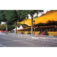 Barrière extensible autoportante et robuste. Supporte de fortes pressions : convient à tout événement qui attire du public (manifestations sportives et culturelles, concerts, salons, stades, parcs d’attraction, …). Simple d’utilisation et de stockage: facile et rapide à mettre en place. Se déplie par roulettes et se stabilise en 5 secondes. Blocage des roulettes : par simple pression sur le frein. Axe et visserie en inox : résiste aux intempéries sans risque de rouille. Les roulettes sont composées de : roues en caoutchouc bleu, de chapes en acier zingué, embouties et pivotantes. Fabriqué en UE