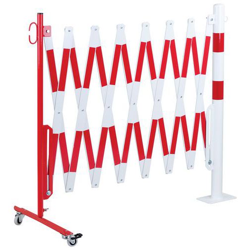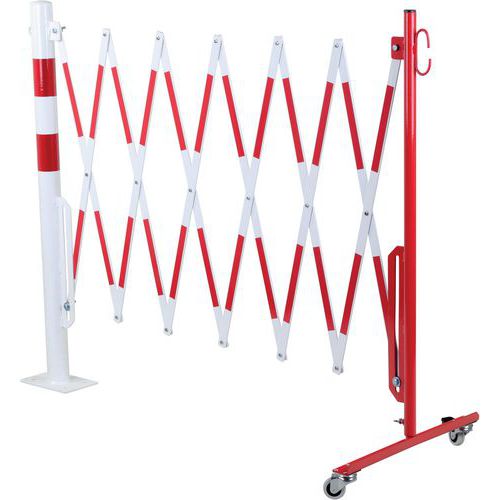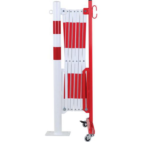 Barrière extensible en acier sur roulettes et poteau rond. Bandes bi-colores pour plus de visibilité. Convient uniquement pour une utilisation intérieur. Facile à manipuler, stocker et utiliser grâce à ses roulettes avec frein. Certificat du TÜV. Platine 120 x 195 mm.