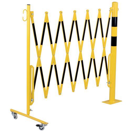 Barrière extensible en acier sur roulettes et poteau rond. Bandes bi-colores pour plus de visibilité. Convient uniquement pour une utilisation intérieur. Facile à manipuler, stocker et utiliser grâce à ses roulettes avec frein. Certificat du TÜV. Platine 120 x 195 mm.