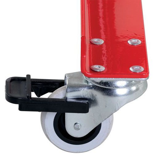 Revêtue par poudrage. Avec écrous autobloquants dans la zone extensible. Avec marquage d'avertissement réfléchissant des deux côtés. Très facile à utiliser. Frein sur roulette compris.
