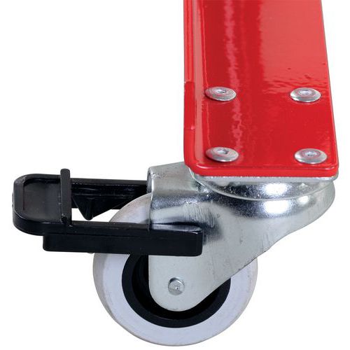 Revêtue par poudrage. Avec écrous autobloquants dans la zone extensible. Avec marquage d'avertissement réfléchissant des deux côtés. Très facile à utiliser. Frein sur roulette compris.