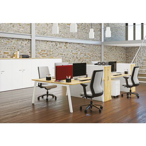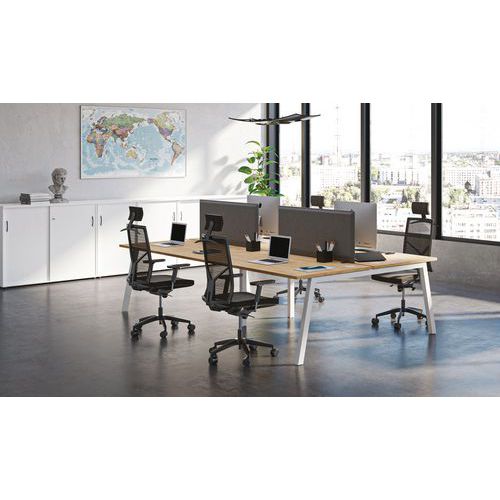 Table bench idéale pour travailler en équipe. Électrification : Plateau équipé d’obturateurs pour le passage de vos câbles. Panneau mélaminé Plateau Structurex® avec chants ABS anti-choc 2 mm. Piétement structure arche A en oblique. Produit à compléter avec Bench 2 postes Départ Partage. Conçu pour favoriser le flexoffice et le coworking. Travaillez en toute mobilité et échangez plus facilement avec vos collègues.