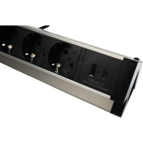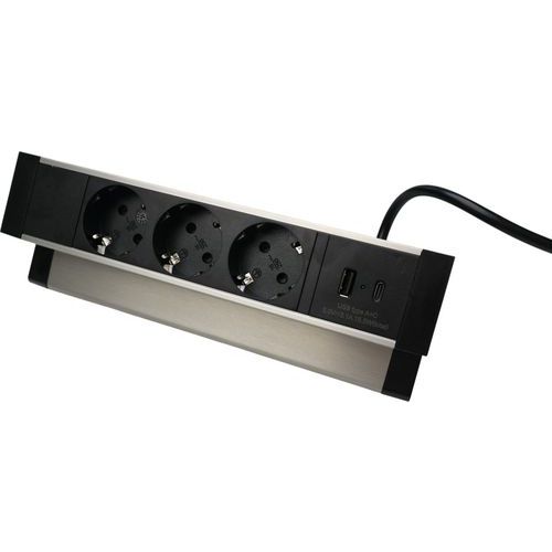 - Bloc multiprises, trois fiches avec contact de protection, disposées à 45° pour une utilisation pratique.