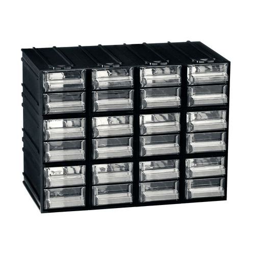 - Bloc-tiroirs solide muni de 24 tiroirs verts ou transparents équipés de porte-étiquettes.