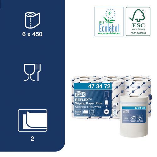 Bobine d'essuyage à devidage central Tork Reflex Plus, Coloris: Blanc, Type: Bobine de papier, Nb de plis: 2 Bobine d'essuyage à devidage central Tork Reflex Plus, Coloris: Blanc, Type: Bobine de papier, Nb de plis: 2