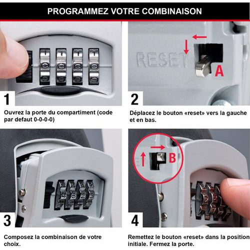 - Combinaison programmable à 4 chiffres avec larges molettes (jusqu'à 10 000 codes disponibles).