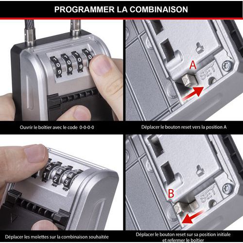 - Combinaison programmable à 4 chiffres avec larges molettes (jusqu'à 10 000 codes disponibles).