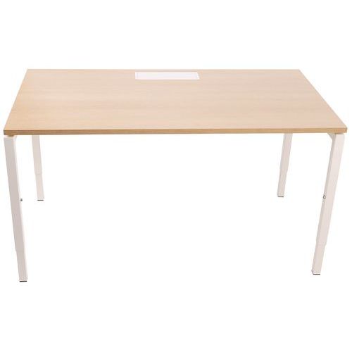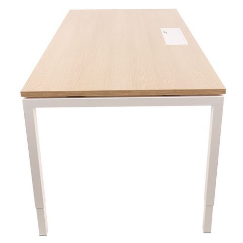 Bureau droit réglable en hauteur au niveau des pieds. Plateau mélaminé 25mm et chants ABS de 2mm. 2 traverses de maintien en tube métallique de 40x20mm. Structure des pieds droit en métal 40x40mm avec vérins en plastique pour le nivellement. Plateau muni d'un passage de câble avec trappe pour aider à la gestion des câbles.