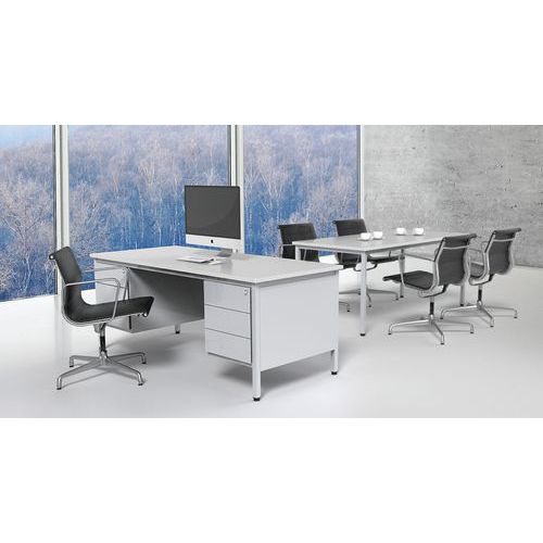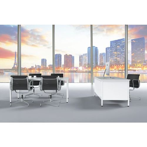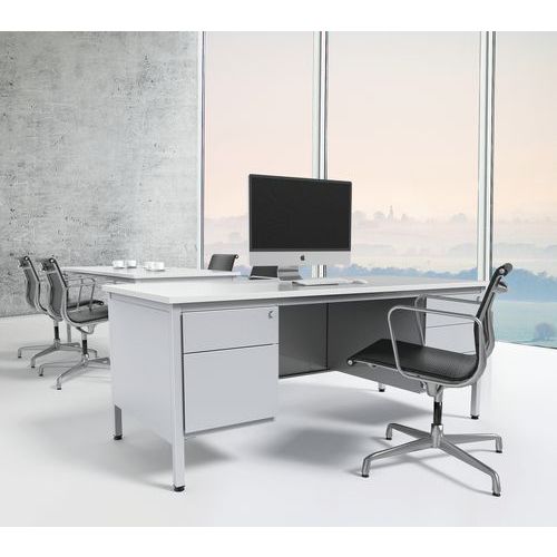 Bureau robuste et intemporel. Plateau antireflet haute résistance (ép.25 mm). Verrouillage central du caisson. Le caisson peut s'installer à droite comme à gauche. Piétements équipés de vérins de réglage. Cadre autoporteur et voile de fond métallique.