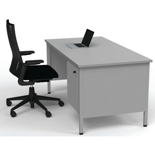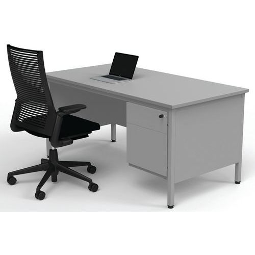 Bureau robuste et intemporel. Plateau antireflet haute résistance (ép.25 mm). Verrouillage central du caisson. Le caisson peut s'installer à droite comme à gauche. Piétements équipés de vérins de réglage. Cadre autoporteur et voile de fond métallique.