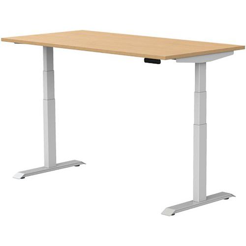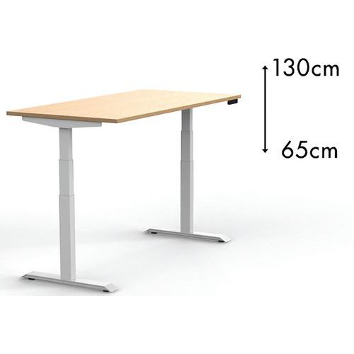 La table assis-debout de Venta T est réglable en hauteur par un clavier (65 – 130 cm). Le clavier est installé de série sur le côté droit de votre table haute. Système à clavier (flèche haut/flèche bas), avec 3 positions en mémoire. La table est munie d’un châssis soudé avec des poutres télescopiques, 2 supports de plateau, 2 piétements en T et 1 plateau. Sur la structure solide est fixée une tablette en aggloméré mélaminé de 25 mm. Toutes les parties sont arrondies d’un rayon pour éviter que l’utilisateur ne se blesse. Compatible avec la gamme de bureau Venta.