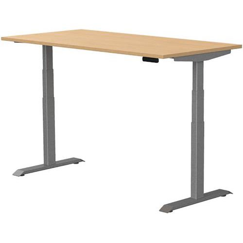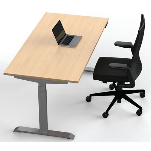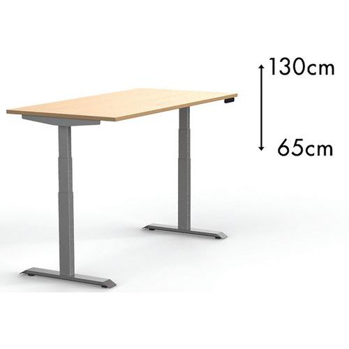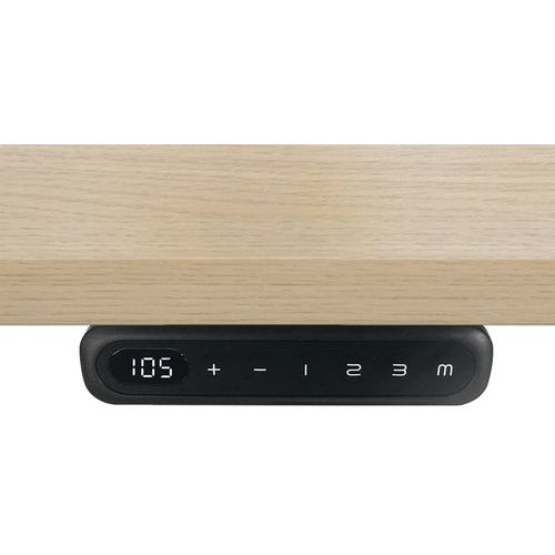 La table assis-debout de Venta T est réglable en hauteur par un clavier (65 – 130 cm). Le clavier est installé de série sur le côté droit de votre table haute. Système à clavier (flèche haut/flèche bas), avec 3 positions en mémoire. La table est munie d’un châssis soudé avec des poutres télescopiques, 2 supports de plateau, 2 piétements en T et 1 plateau. Sur la structure solide est fixée une tablette en aggloméré mélaminé de 25 mm. Toutes les parties sont arrondies d’un rayon pour éviter que l’utilisateur ne se blesse. Compatible avec la gamme de bureau Venta.