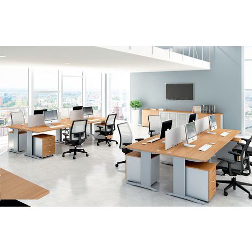 Bureau simple et pratique. Plateau mélaminé lavable, anti-rayures et antireflets. Passage de câbles avec bouchon. Equipé d’un voile de fond structurelle épaisseur de 18 mm pour une discrétion. Idéal le réaménagement tiers-lieux