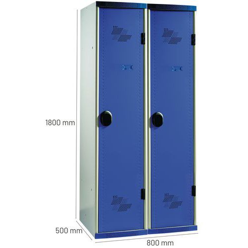 Vestiaire en tôle d'acier 1er choix, de belle rigidité, indéformable. Tôle d'acier 6/1e profilée (équivaut à pliage standard 8/1e). Colonnes soudées entre elles pour une plus grande solidité. Double penderie séparée pour vêtements propres et sales. Excellente résistance mécanique avec profil fermé agrafé. Porte indégondable ouverte ou fermée, antieffraction. Articulation sur charnières avec ouverture à 18°. Armoire vestiaire avec porte-étiquette embouti.