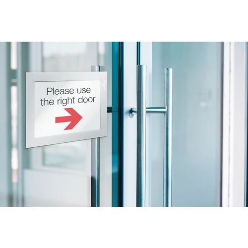Cadre d'affichage adhésif Duraframe® pour surface lisse. Grâce au dos adhésif repositionnable, le cadre se colle et se décolle sur toute surfaces lisses et rigides, comme des murs, des portes… Lisibilité recto-verso du document sur une surface vitrée. Actualisation simple et rapide, maintien des documents grâce à l'encadrement magnétique. Utilisation au format portrait ou paysage. Solution idéale pour afficher les informations générales et obligatoires d'entreprise, les promotions, les règlements intérieurs, les notes d'information etc.