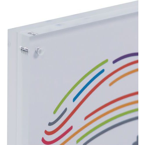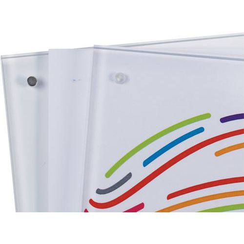 Cadre photo ou porte affichette transparent à fermeture magnétique. Insertion du document ou de la photo entre 2 plaques de plexiglass aimantées. Fermeture via 8 puissants aimants boutons aux 4 angles. Se place debout sens portrait ou paysage ou bien à plat. Fabriqué en UE