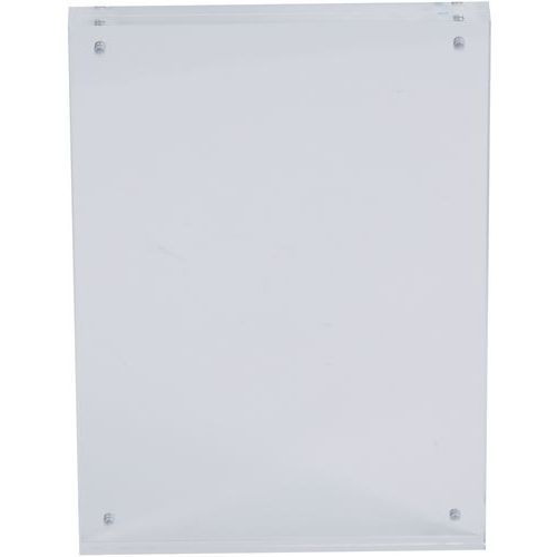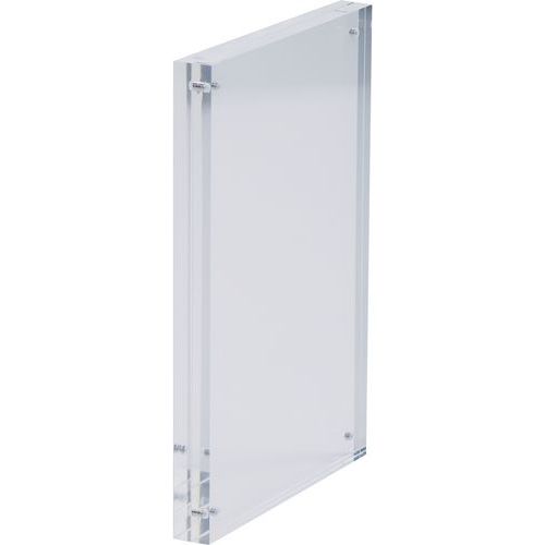 Cadre photo ou porte affichette transparent à fermeture magnétique. Insertion du document ou de la photo entre 2 plaques de plexiglass aimantées. Fermeture via 8 puissants aimants boutons aux 4 angles. Se place debout sens portrait ou paysage ou bien à plat.