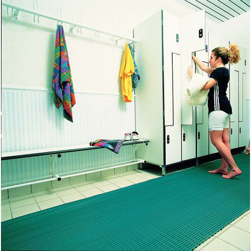 Rouleau de caillebotis antidérapant pour les espaces collectifs. Hygiénique avec matériau non poreux et additifs antimicrobiens, antifongiques. Conception innovante pour un drainage ultra-efficace de l’eau. Caillebotis faciles à découper, à mettre en place et enlever. Relief antidérapant pour une excellente stabilité.