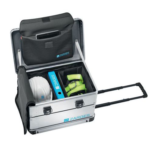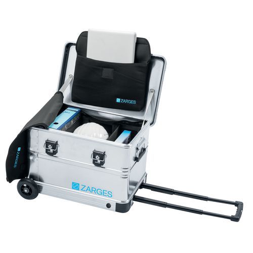 Caisse à roulettes en alliage d'aluminium extra-dur, anti-corrosif, inaltérable. Couvercle retenu par 2 sangles et ouvrant à 110°, coins de gerbage ABS. Caisson constitué de 2 demi-enveloppes assemblées par soudure par points. Fond serti sur profilé inférieur du caisson équipé de 2 roulettes PU Ø 50 mm. Ultra-solide avec protection d'angle métal : nervures et circulaires de renfort. Pourtours supérieurs et inférieurs et du couvercle en profilé aluminium massif. 3 poignées : 1 télescopique, 2 de transport gainées PVC rabattables à ressort. 2 grenouillères rivetées cadenassables ou plombables équipées d'1 serrure à clé.