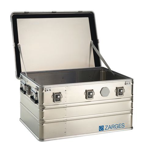 Caisse universelle aluminium extra dur, anti-corrosif, inaltérable. Étanche jusqu'à 1 m sous l'eau, résistance environnement salin. Couvercle à charnière inox avec joint continu en mousse injectée. Stabilité élevée avec profilés et joints aluminium entièrement soudés. Grande résistance empilage et gerbage avec coins en fonte d'aluminium. Fermeture ergonomique garante de 2 cycles d'actionnement minimum. Poignées tombantes ergonomiques à ressort pour des charges allant jusqu'à 5 kg.