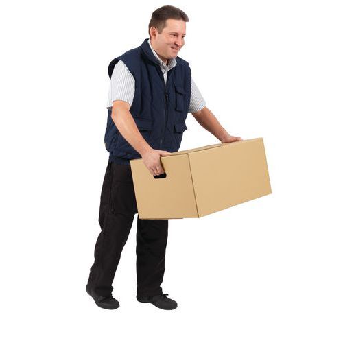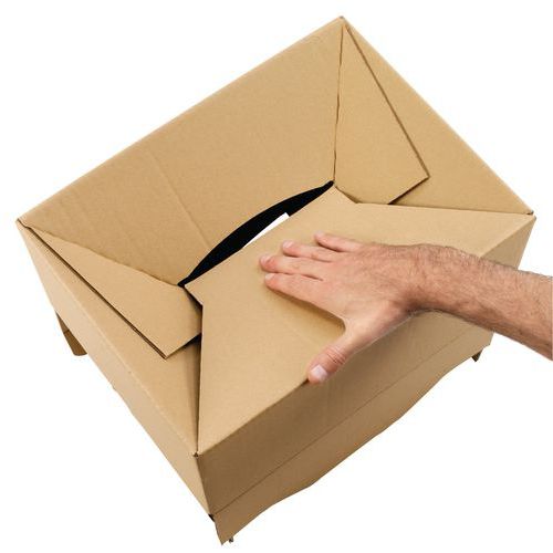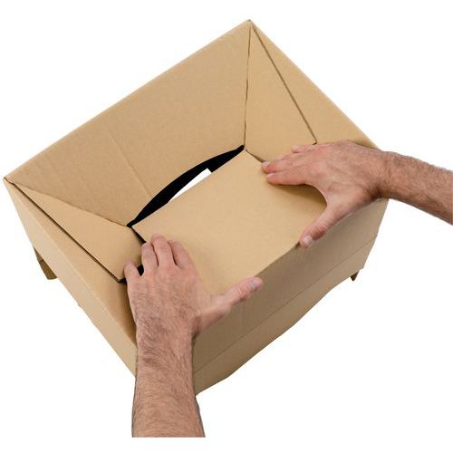 Caisse préformée pour dépliement ultra-rapide. Solide avec fond double épaisseur. Caisse carton à poignées latérales. Préparez vos cartons en un tour de main