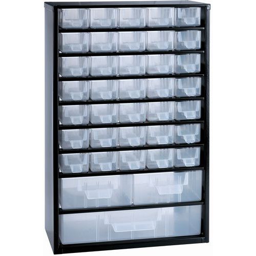 - Casier métal à tiroirs plastique transparent.