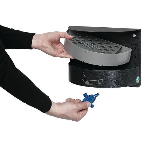 Cendrier mural d'extérieur avec chapeau de protection pluie. Résistance aux intempéries avec revêtement poudre époxy anti-UV. Robuste : construction durable de qualité, matériau tôle d‘acier galvanisé. Cendrier de vidange aisée, sécurisée par clé panneton double (1 clé), anti-vol.