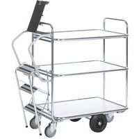 Chariot à échelle avec 3 plateaux, stable à utiliser pour la préparation de commandes dans l'entrepôt.