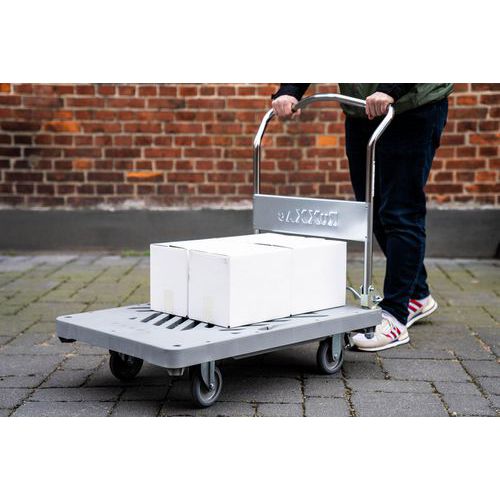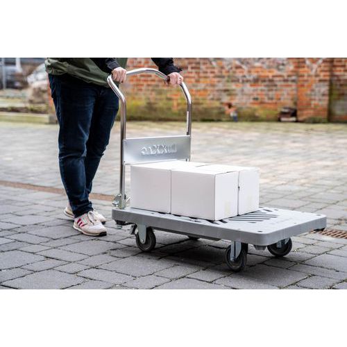 Chariot plate-forme Dandy RuXXac à frein avec barre de poussée rabattable.