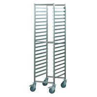 Chariot à glissières en inox 18/10. Espacement de 75 mm. Les profilés sont relevés à chaque extrémité,comme butée de sécurité pour un bon maintien des plateaux et grilles pendant l'utilisation. Equipé de 4 roues pivotantes, Ø 125 mm dont 2 à frein, en polyamide et pare-chocs ronds.