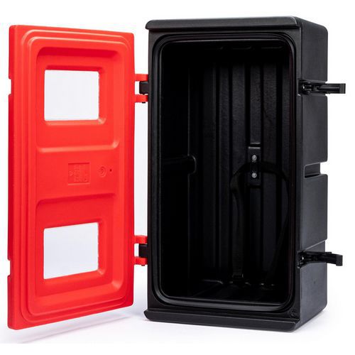 | Intitulé du produit | Coffre extincteur, Matériau: Polyéthylène haute densité, Coloris: Rouge/noir, Pour extincteur poids: 12 kg |