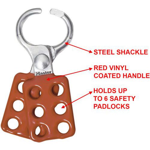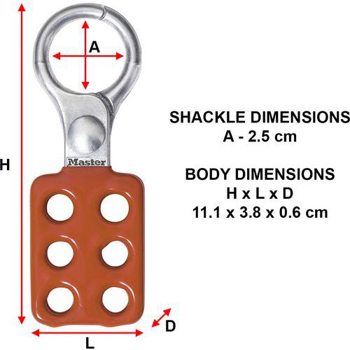 - Le crochet de consignation en aluminium Master Lock n° 416 présente un diamètre intérieur de mâchoire de 25 mm et peut accueillir jusqu'à six cadenas.